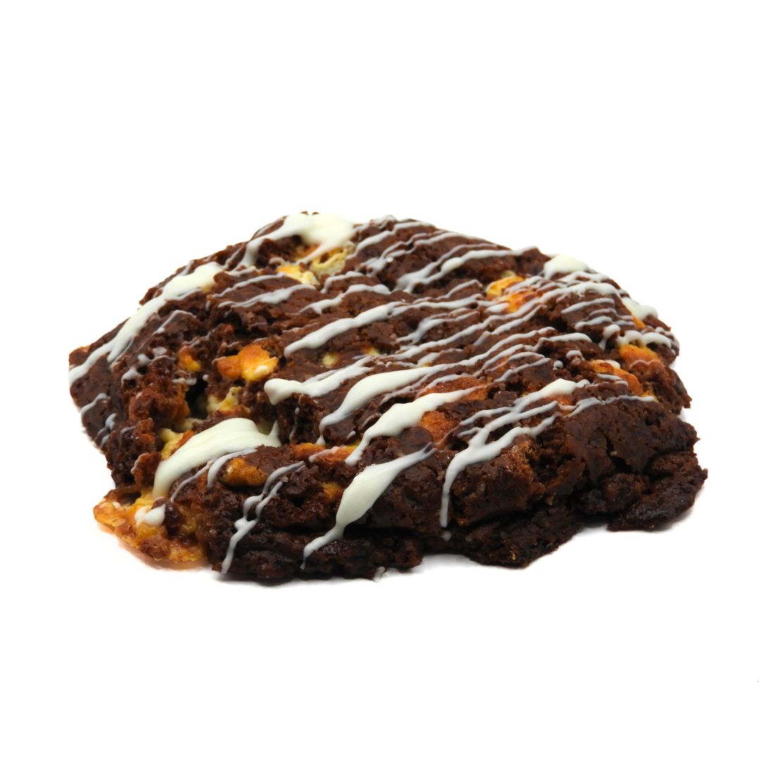 Cookie elaborada con masa de chocolate negro y chips de chocolate del mismo tipo, con un suave relleno de chocolate blanco en su interior que aporta contraste y cremosidad al conjunto. Una combinación clásica que equilibra intensidad y dulzor. Cada galleta tiene un peso aproximado de 150 g.