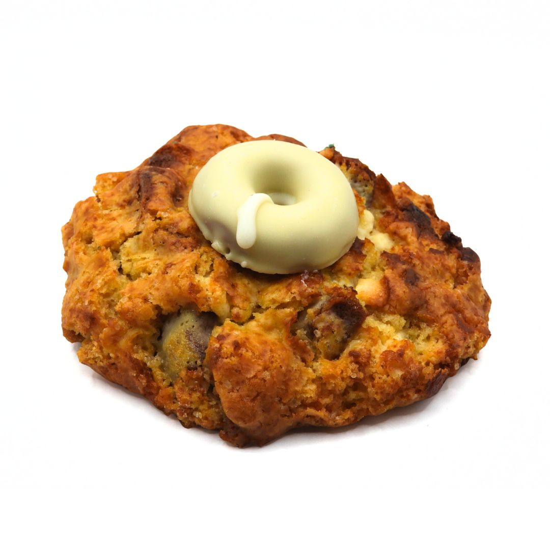 Cookie de masa clásica con chips de chocolate blanco, pequeños trozos de galleta tipo Filipinos blanco y un relleno de chocolate blanco cremoso en su interior.